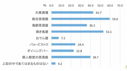 2017/12/09 よく行く居酒屋のジャンルは? 一都三県にお住まいの30〜40代の男女を対象に、よく行く居酒屋のジャンルについて独自調査しました。その結果、最も多いのが総合居酒屋、次に多いのが焼き鳥屋であることがわかりました。 あなたのよく行くお店のジャンルについて、あてはまるものをお答えください。(お答えはいくつでも) ※2017年9月 弊社調べ(n=307) 月に1~3回程度居酒屋利用する方を対象 ●総合居酒屋 59.6% ●焼き鳥屋 53...