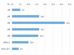 2017/12/23 居酒屋でお酒を何杯飲みますか? お客様は居酒屋で平均何品注文しているのでしょうか?一都三県にお住まいの30〜40代の男女を対象に調査しました。あなたのお店と比べて、注文数は多いでしょうか?それとも少ないでしょうか? あなたは、居酒屋でお酒を平均何杯注文しますか? ※2017年9月 弊社調べ(n=200) 月に1~3回程度居酒屋利用する方を対象 ●1杯 5% ●2杯 16.5% ●3杯 32% ●4杯 16.5% ●5杯 16% ●6杯以上 10% ●注文し...