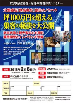 この度、開業支援集団RING(リング)主催の「飲食店経営者・幹部候補様向けセミナー」を開催いたします。 今回は、坪売上100万円を超える大繁盛店「鉄板神社」を展開する、株式会社 寿幸 広報・人事部長 門田桂太郎氏をお招きし、地元客だけでなく訪日外国人観光客の心も掴む、業態開発や独自の接客術についてお話しいただきます。 出席のお申し込みは、本サイトのお問い合わせフォームに、貴社名とご参加者氏名、お役職をご記入の上、お送りくだ...